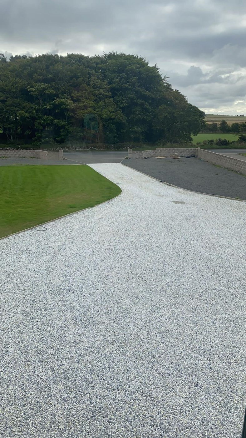 Groundworks, carefully scrape all clean chippings off driveway and stockpile for reuse, set out and excavate for foundations for double path edge stone border at either side of driveway, lay path edge stones and set on and in sharp sand and cement mix, lay cabling in ducting for garden lighting, relay and grade clean chippings previously set aside, landscape area around new path edge stones.
